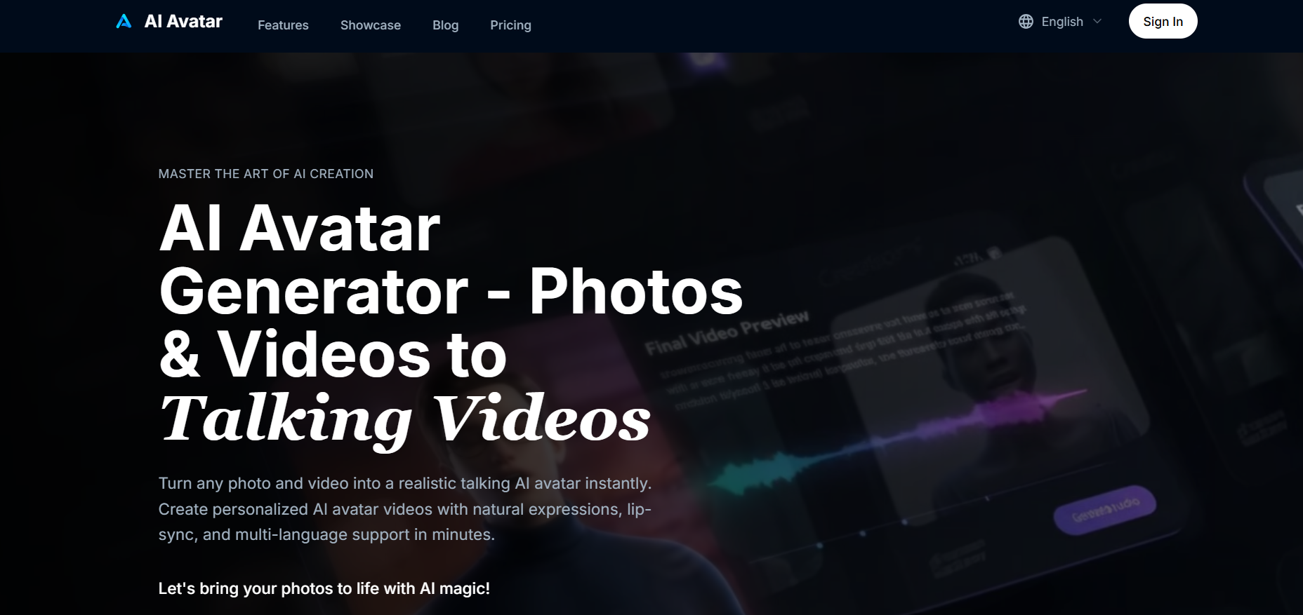 AI Avatar AI Avatar Art creates realistic talking videos from photos, generating personalized avatars with natural expressions and lip-sync in 40+ languages. Customize appearance, voice, and speech speed for instant, high-quality video output. Read More