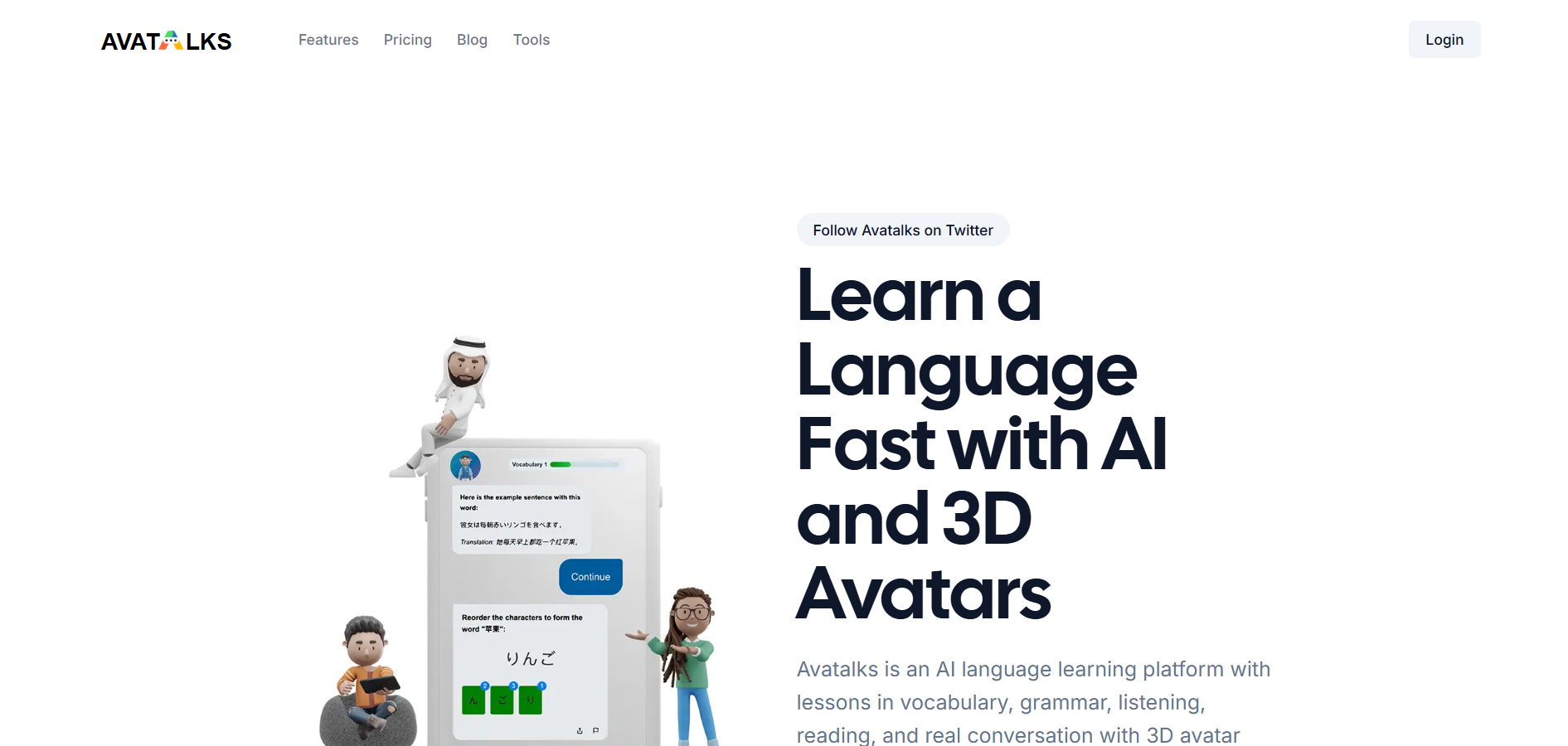 Avatalks is an interactive language learning platform offering six practice modes for vocabulary, grammar, listening, reading, and writing with real-time feedback. It includes an AI chat partner, native speech practice, and progress tracking across twenty languages.