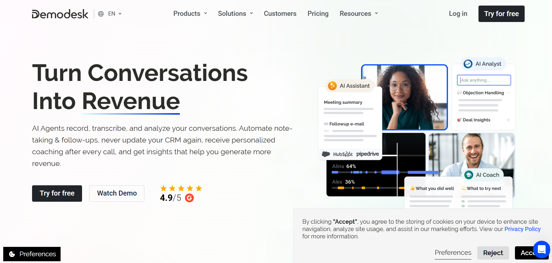 Demodesk is a browser-based, AI-powered meeting platform designed specifically for customer-facing teams. It offers real-time sales coaching, automated scheduling, CRM integration, and dynamic content sharing all without downloads or extensions. Its virtual display technology enables seamless screen sharing and interactive demos, while built-in playbooks and battle cards guide reps during live calls. Its core purpose is to boost sales productivity and quota attainment by transforming remote meetings into structured, data-driven conversations empowering reps to sell smarter and faster from anywhere.