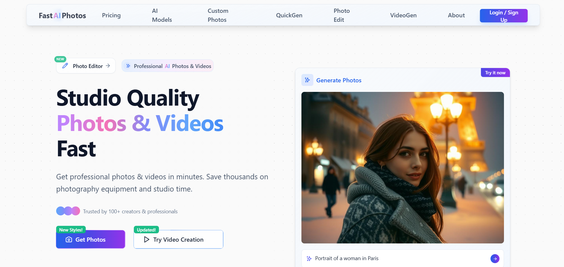 FastAIPhotos FastAI Photos is an AI platform for generating high-quality images and videos. It offers customizable models for personalized outputs, professional headshots, and the QuickGen feature for instant portraits, suitable for social media and marketing. Read More