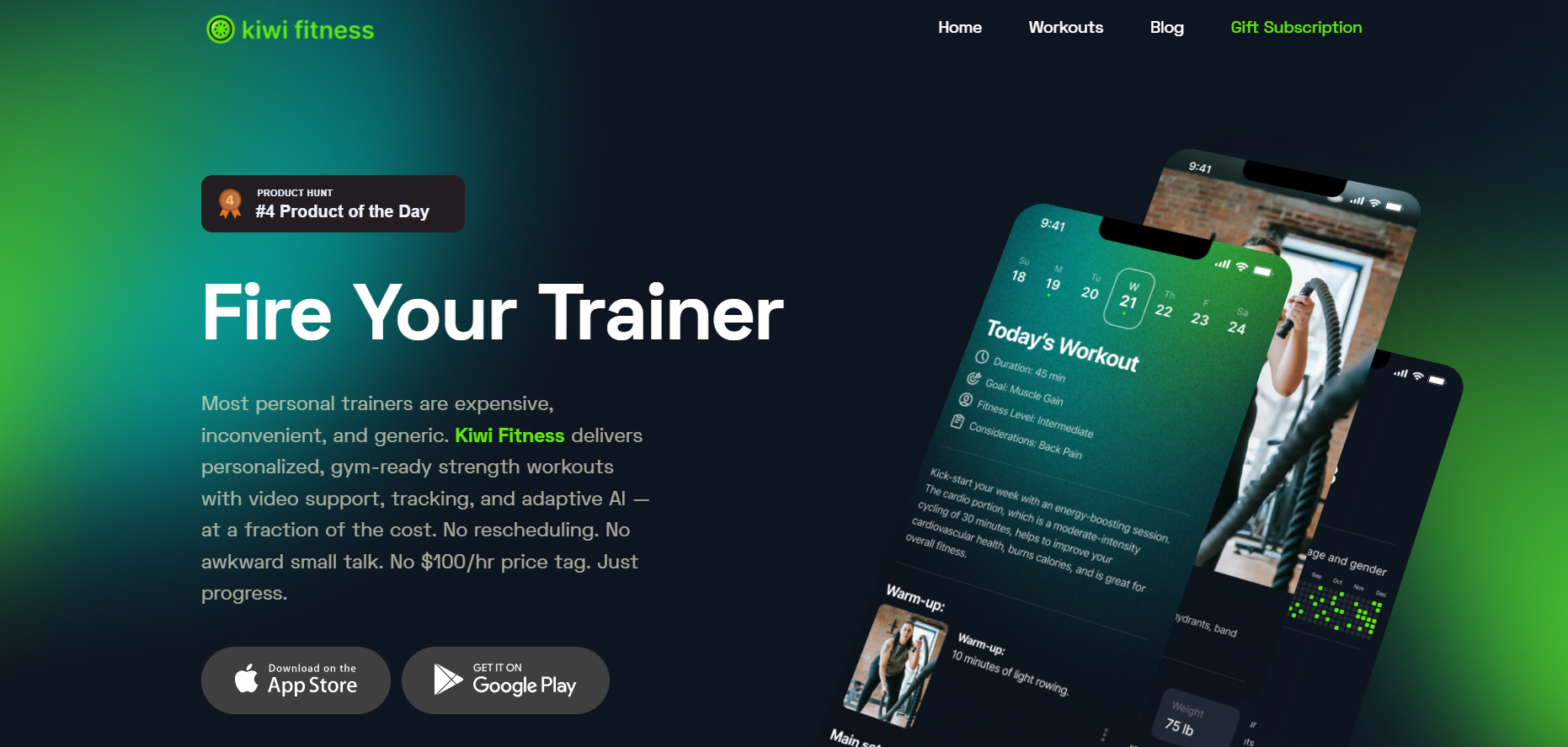 Kiwi Fitness is an AI-powered personal trainer that delivers personalized, science-backed workout plans with real-time support. It uses gamification, community features, and adaptive programs to keep users engaged and motivated at home or in the gym.