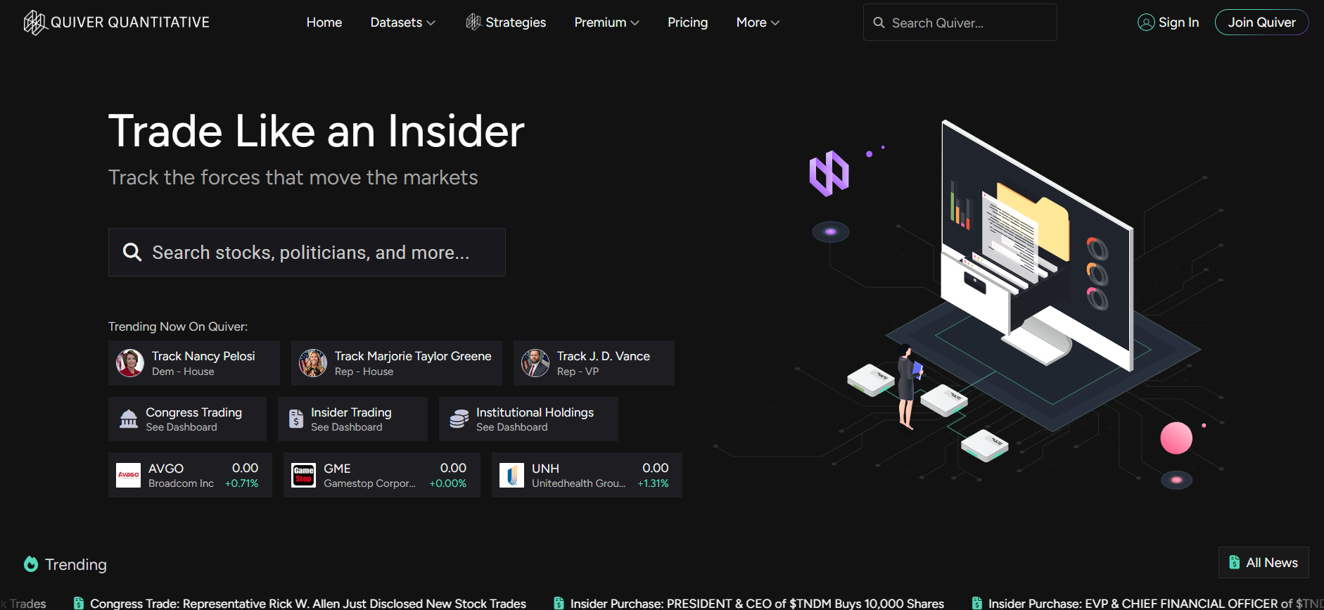 Quiver Quantitative is a free investment research platform that aggregates alternative data like congressional trades, insider transactions, and social sentiment to help retail investors make more informed decisions. Its purpose is to democratize access to institutional-grade insights by transforming public disclosures and unconventional datasets into actionable market intelligence.