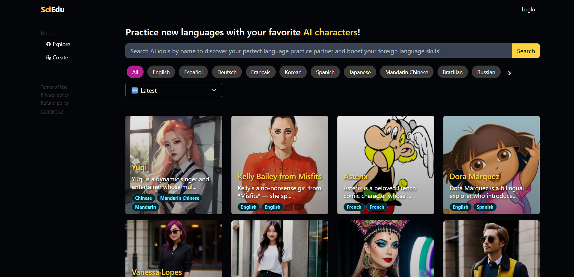 Scieduis is an interactive language learning platform featuring AI-powered character coaches for personalized practice in multiple languages. Users engage with fictional and celebrity personas to master languages like English, Spanish, and Mandarin through immersive, adaptive conversations