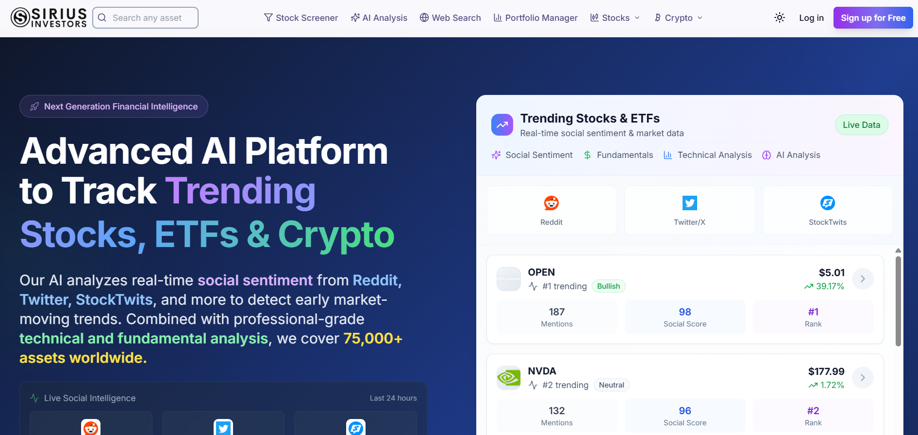 Sirius Investors is an AI-driven platform for investment analysis, offering real-time insights on stocks, cryptocurrencies, and ETFs. It features technical analysis, customizable screening, automated research, sentiment analysis, and market news to aid informed decision-making.