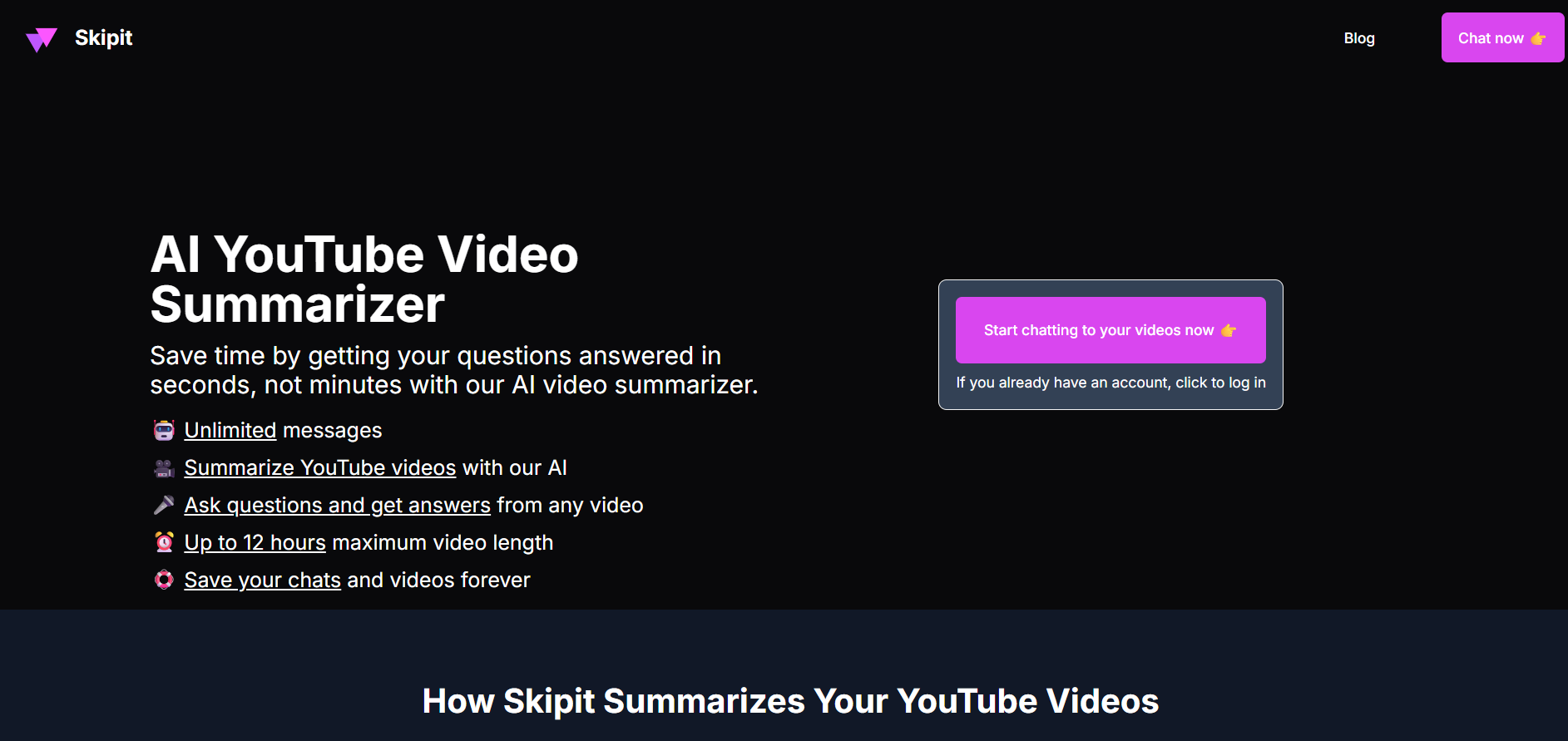 Skipit Skipit is an video summarizer that generates concise summaries of YouTube videos, allowing users to save time and engage with video content through precise answers to specific questions and a saved chat history. Read More