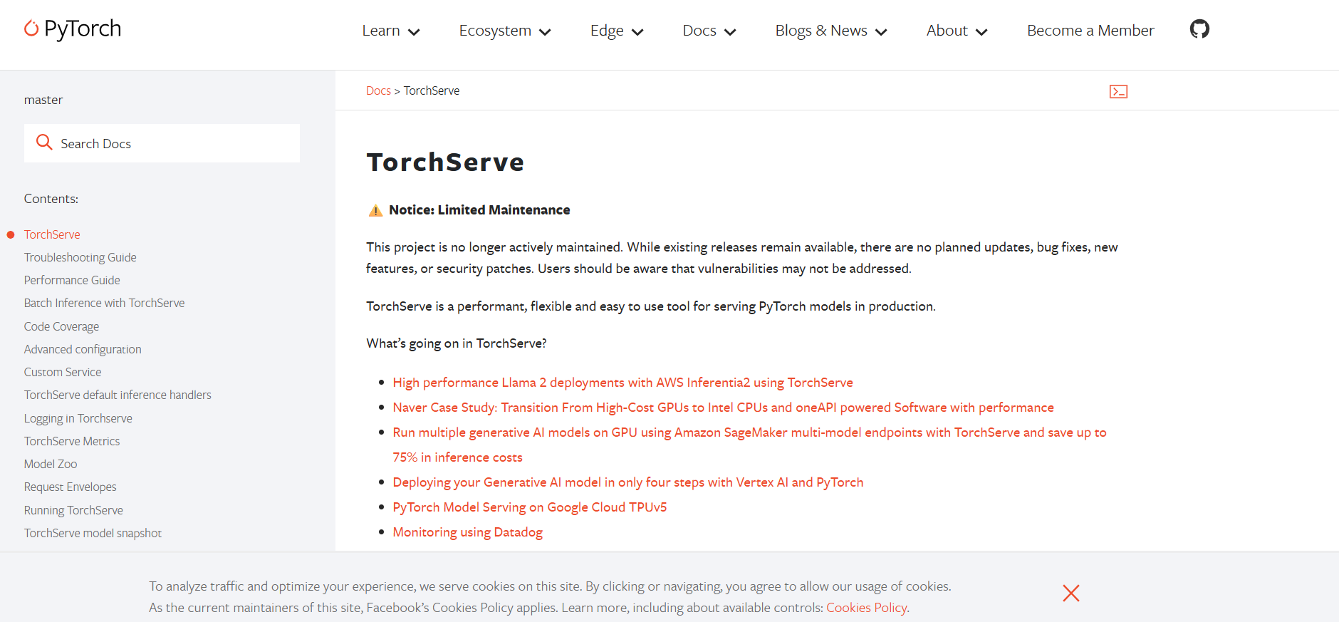 Flexible and production-ready model serving framework developed by PyTorch to deploy deep learning models at scale using RESTful APIs. Its purpose is to simplify the process of hosting, managing, and scaling PyTorch models with features like multi-model serving, versioning, logging, and metrics ideal for real-time inference in enterprise and cloud environments.