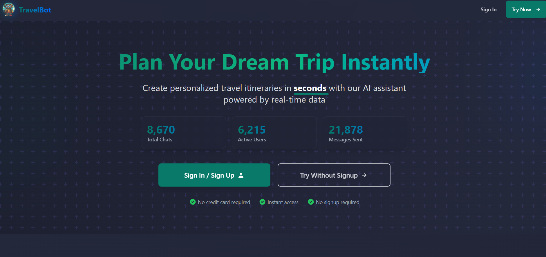 Travelbot is an AI travel companion that simplifies trip planning by generating spontaneous destination ideas and creating detailed itineraries, helping users enhance their travel experiences with minimal effort. Sign-in options include magic link, Google, and Apple accounts.