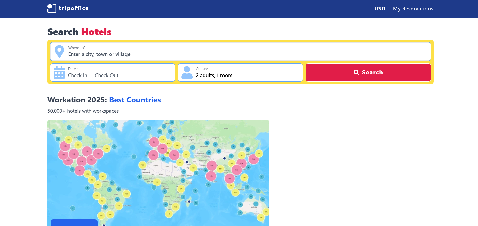 TripOffice Tripoffice.com is an online platform for booking workation accommodations with access to over 50,000 hotels and apartments across 120 destinations. Users can filter options by dates and view results on a map for easy navigation. Read More
