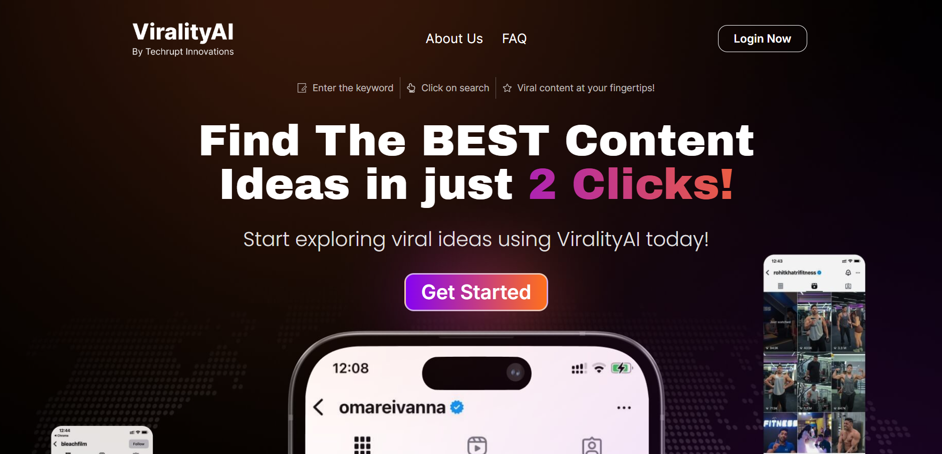 Platform that helps content creators discover viral content ideas by analyzing trends, audience behavior, and platform dynamics. Its purpose is to streamline the brainstorming process, enabling users to generate high-impact, shareable content quickly and effectively across social media channels.